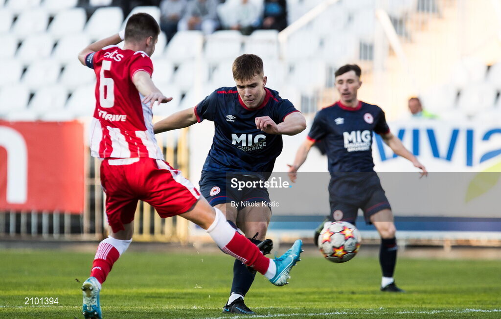20 October 2021; Thomas Lonergan of St Patrick's Athletic has a shot on goal despite the tackle of Marko Curic of Crvena Zvezda during the UEFA Youth League first round second leg match between Crvena Zvezda and St Patrick’s Athletic at Cukaricki Stadium in Belgrade, Serbia. Photo by Nikola Krstic/Sportsfile