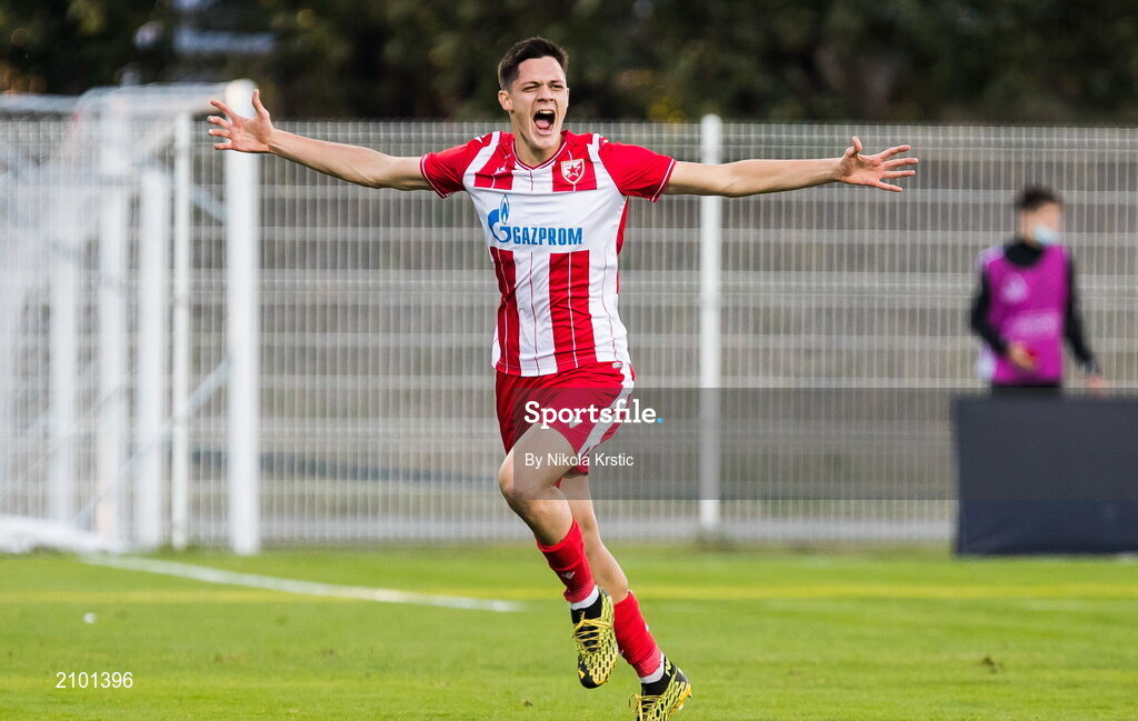 20 October 2021; Stefan Lekovic of Crvena Zvezda celebrates after scoring his side's first goal during the UEFA Youth League first round second leg match between Crvena Zvezda and St Patrick’s Athletic at Cukaricki Stadium in Belgrade, Serbia. Photo by Nikola Krstic/Sportsfile