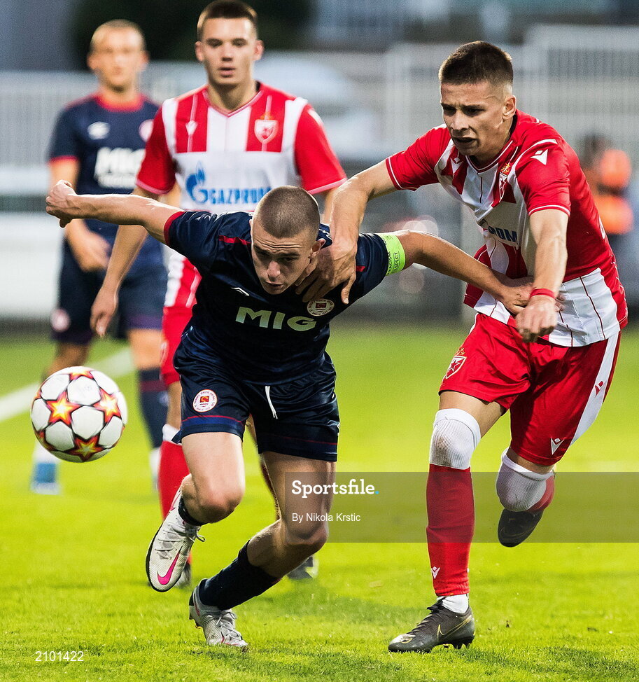 20 October 2021; Adam Murphy of St Patrick's Athletic in action against Viktor Radojevic of Crvena Zvezda during the UEFA Youth League first round second leg match between Crvena Zvezda and St Patrick’s Athletic at Cukaricki Stadium in Belgrade, Serbia. Photo by Nikola Krstic/Sportsfile