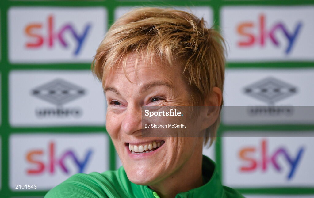 20 October 2021; Manager Vera Pauw speaks to media ahead of a Republic of Ireland training session at Tallaght Stadium in Dublin. Photo by Stephen McCarthy/Sportsfile