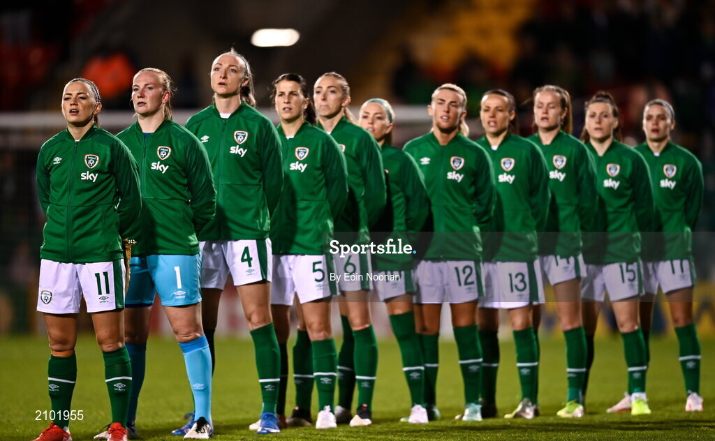 21 October 2021; The Republic of Ireland team stand for Amhrán na bhFiann before the FIFA Women's World Cup 2023 qualifier group A match between Republic of Ireland and Sweden at Tallaght Stadium in Dublin. Photo by Eóin Noonan/Sportsfile