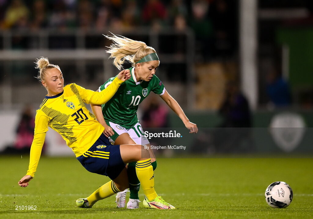 21 October 2021; Hanna Bennison of Sweden in action against Denise O'Sullivan of Republic of Ireland during the FIFA Women's World Cup 2023 qualifier group A match between Republic of Ireland and Sweden at Tallaght Stadium in Dublin. Photo by Stephen McCarthy/Sportsfile