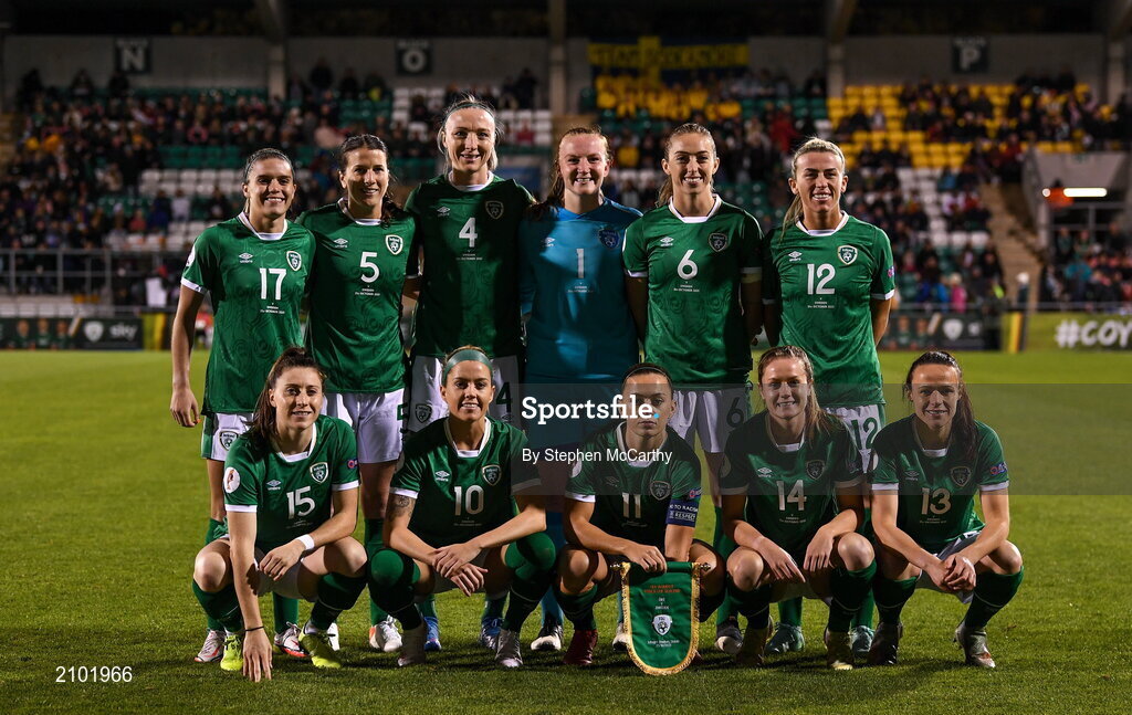 21 October 2021; The Republic of Ireland team, back row, from left, Jamie Finn, Niamh Fahey, Louise Quinn, Courtney Brosnan, Megan Connolly, Savannah McCarthy and front row, from left, Lucy Quinn, Denise O'Sullivan, Katie McCabe, Heather Payne and Áine O'Gorman before the FIFA Women's World Cup 2023 qualifier group A match between Republic of Ireland and Sweden at Tallaght Stadium in Dublin. Photo by Stephen McCarthy/Sportsfile