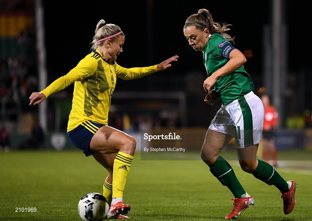 21 October 2021; Katie McCabe of Republic of Ireland in action against Hanna Glas of Sweden during the FIFA Women's World Cup 2023 qualifier group A match between Republic of Ireland and Sweden at Tallaght Stadium in Dublin. Photo by Stephen McCarthy/Sportsfile