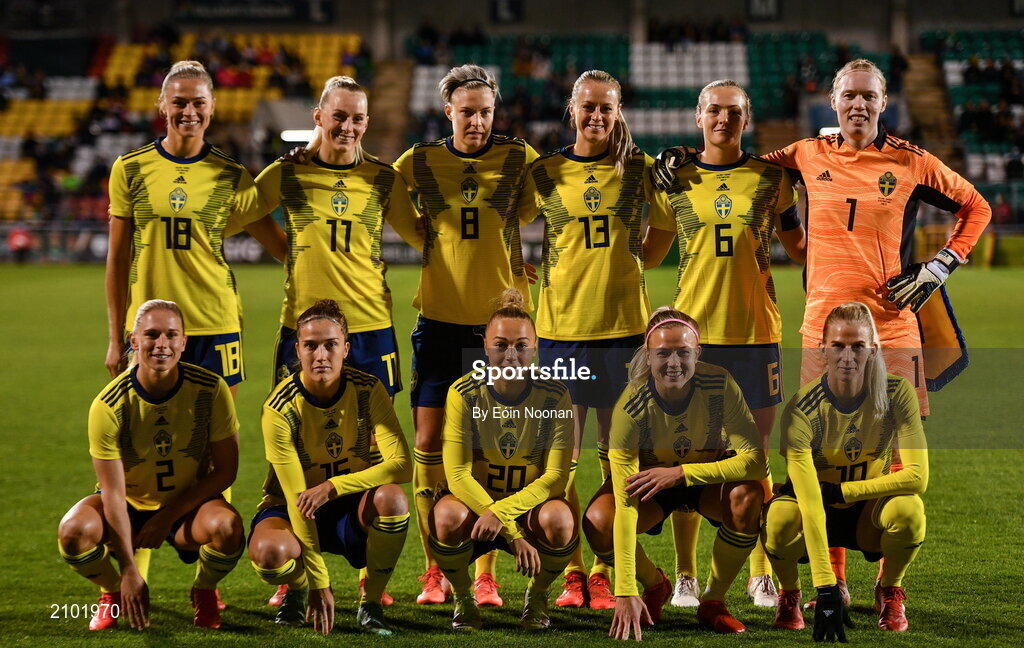 21 October 2021; The Sweden team, back row, from left, Fridolina Rolfu, Stina Blackstenius, Lina Hurtig, Amanda Ilestedt, Magdalena Eriksson, Hedvig Lindahl and front row, from left, Nilla Fischer, Julia Zigiotti Olme, Hanna Bennison, Jonna Andersson and Sofia Jakobsson of Sweden before the FIFA Women's World Cup 2023 qualifier group A match between Republic of Ireland and Sweden at Tallaght Stadium in Dublin. Photo by Eóin Noonan/Sportsfile