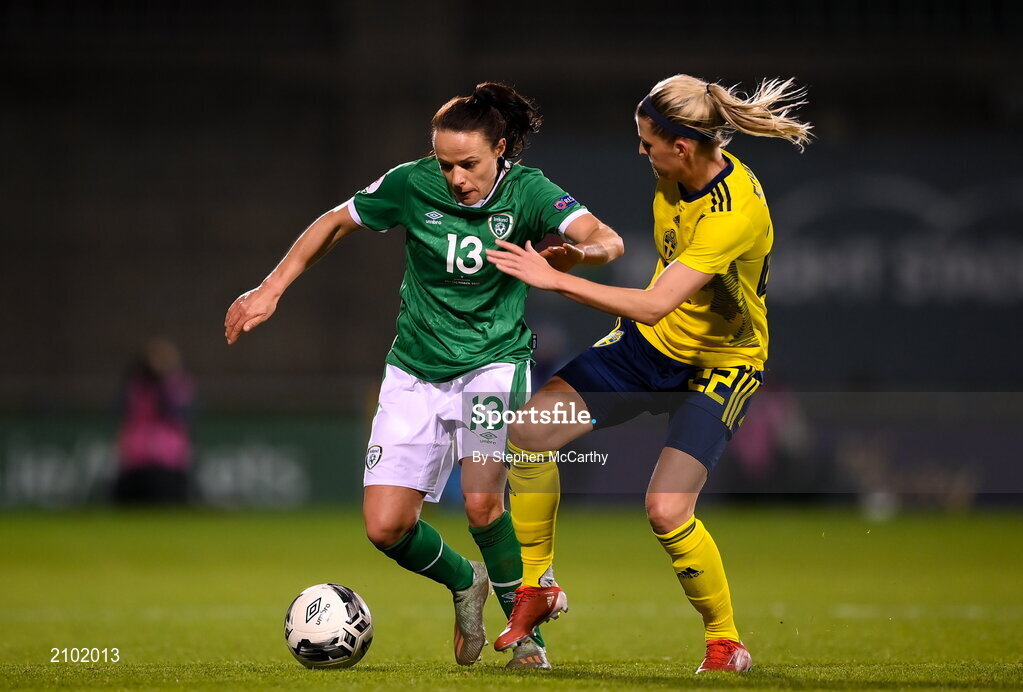 21 October 2021; Áine O'Gorman of Republic of Ireland in action against Olivia Schough of Sweden during the FIFA Women's World Cup 2023 qualifier group A match between Republic of Ireland and Sweden at Tallaght Stadium in Dublin. Photo by Stephen McCarthy/Sportsfile