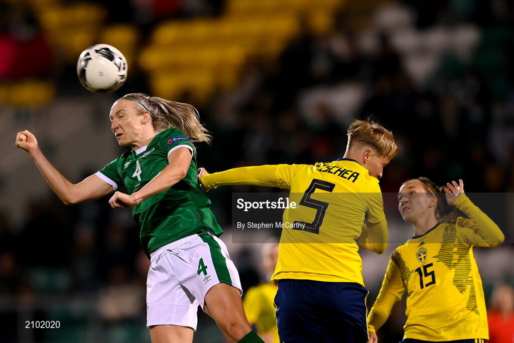 21 October 2021; Louise Quinn of Republic of Ireland in action against Nilla Fischer, centre, and Julia Zigiotti Olme of Sweden during the FIFA Women's World Cup 2023 qualifier group A match between Republic of Ireland and Sweden at Tallaght Stadium in Dublin. Photo by Stephen McCarthy/Sportsfile