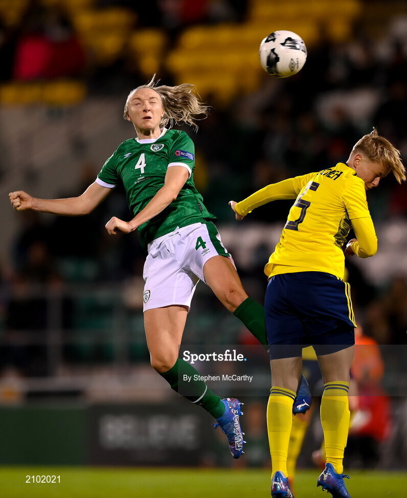 21 October 2021; Louise Quinn of Republic of Ireland in action against Nilla Fischer of Sweden during the FIFA Women's World Cup 2023 qualifier group A match between Republic of Ireland and Sweden at Tallaght Stadium in Dublin. Photo by Stephen McCarthy/Sportsfile