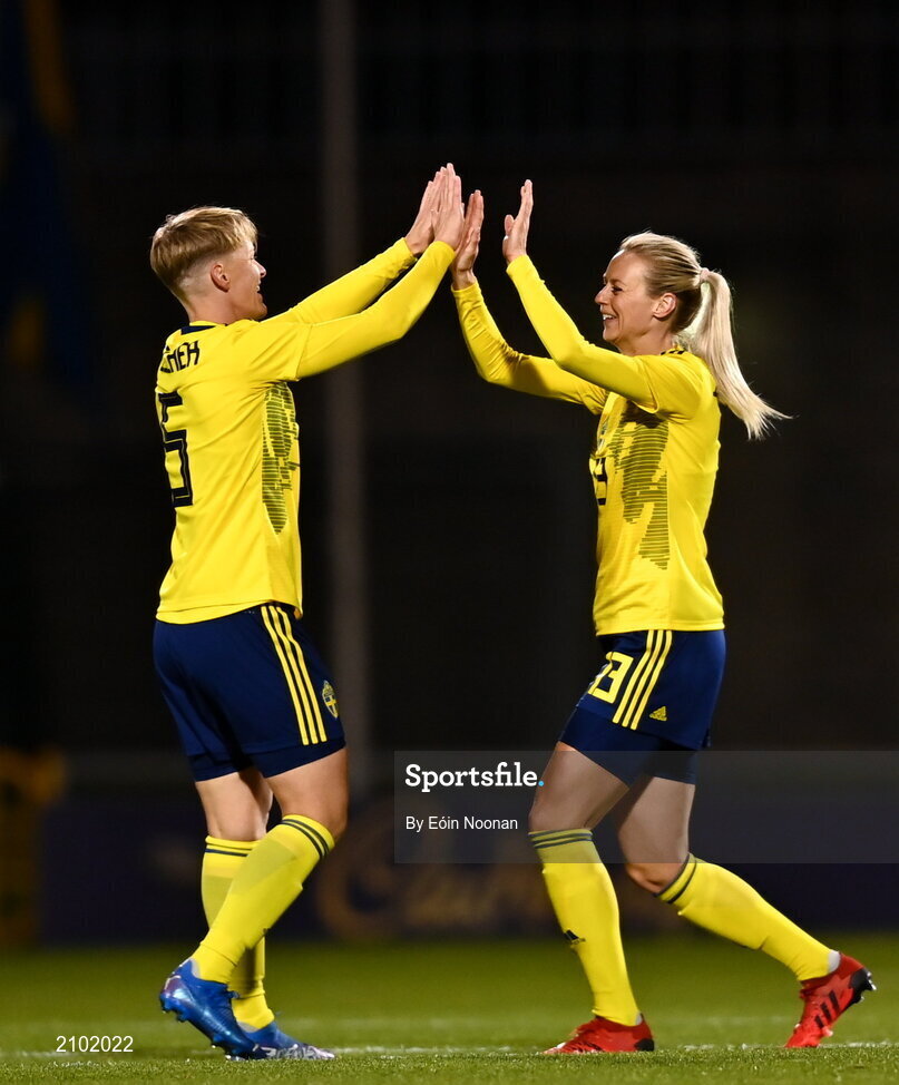 21 October 2021; Nilla Fischer, left, and Amanda Ilestedt of Sweden celebrate after the FIFA Women's World Cup 2023 qualifier group A match between Republic of Ireland and Sweden at Tallaght Stadium in Dublin. Photo by Eóin Noonan/Sportsfile