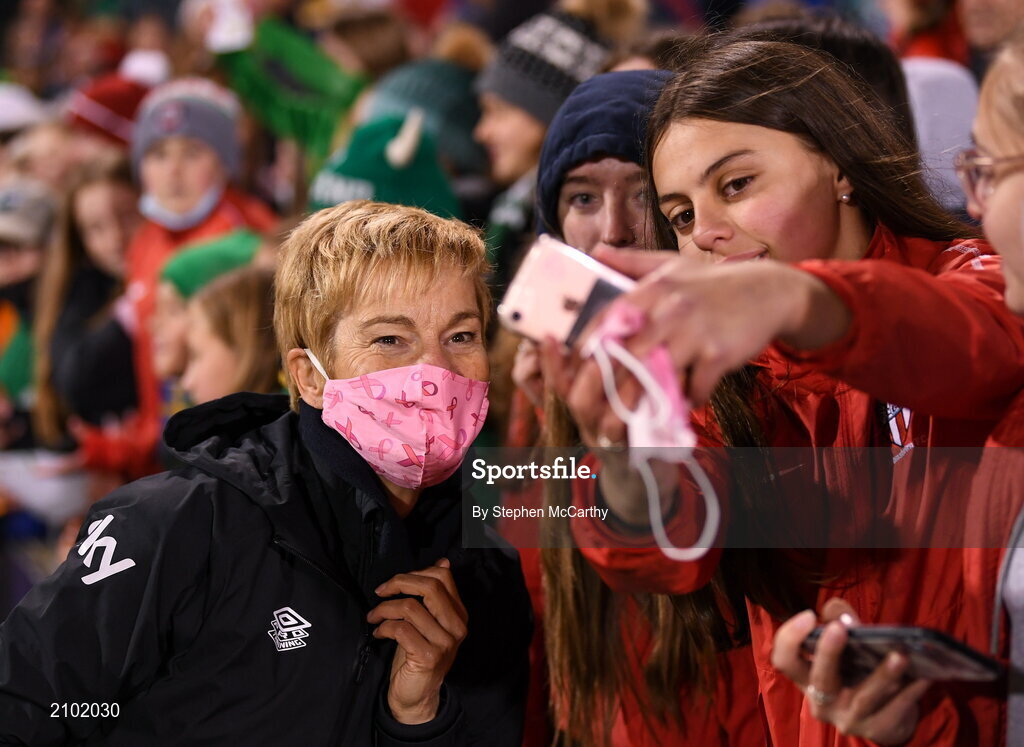 21 October 2021; Republic of Ireland manager Vera Pauw with supporters after the FIFA Women's World Cup 2023 qualifier group A match between Republic of Ireland and Sweden at Tallaght Stadium in Dublin. Photo by Stephen McCarthy/Sportsfile