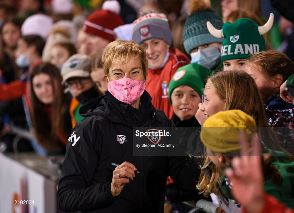 21 October 2021; Republic of Ireland manager Vera Pauw with supporters after the FIFA Women's World Cup 2023 qualifier group A match between Republic of Ireland and Sweden at Tallaght Stadium in Dublin. Photo by Stephen McCarthy/Sportsfile
