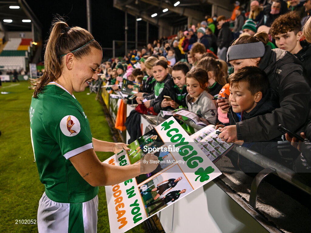 21 October 2021; Katie McCabe of Republic of Ireland signs a poster after the FIFA Women's World Cup 2023 qualifier group A match between Republic of Ireland and Sweden at Tallaght Stadium in Dublin. Photo by Stephen McCarthy/Sportsfile
