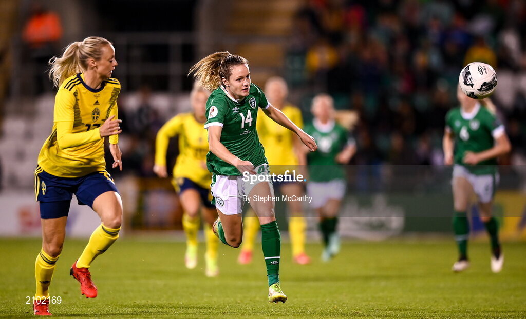 21 October 2021; Heather Payne of Republic of Ireland in action against Amanda Ilestedt of Sweden during the FIFA Women's World Cup 2023 qualifier group A match between Republic of Ireland and Sweden at Tallaght Stadium in Dublin. Photo by Stephen McCarthy/Sportsfile