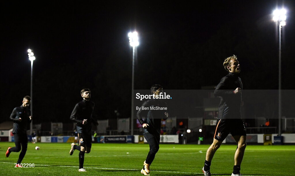 22 October 2021; Dundalk players, from right, Greg Sloggett, Han Jeongwoo, Sam Stanton and Cameron Dummigan warm-up before the Extra.ie FAI Cup Semi-Final match between St Patrick's Athletic and Dundalk at Richmond Park in Dublin. Photo by Ben McShane/Sportsfile