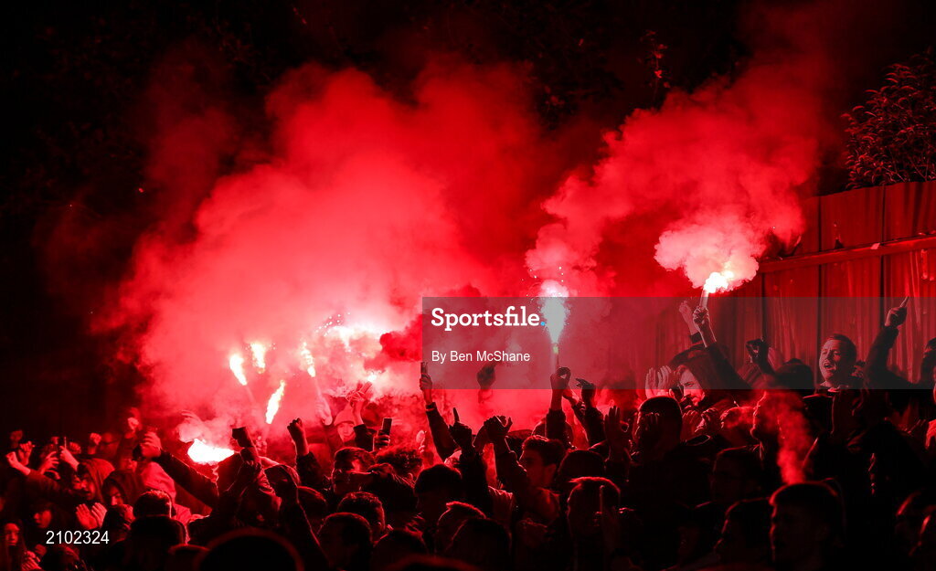 22 October 2021; Dundalk supporters before the Extra.ie FAI Cup Semi-Final match between St Patrick's Athletic and Dundalk at Richmond Park in Dublin. Photo by Ben McShane/Sportsfile