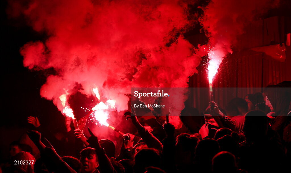 22 October 2021; Dundalk supporters before the Extra.ie FAI Cup Semi-Final match between St Patrick's Athletic and Dundalk at Richmond Park in Dublin. Photo by Ben McShane/Sportsfile