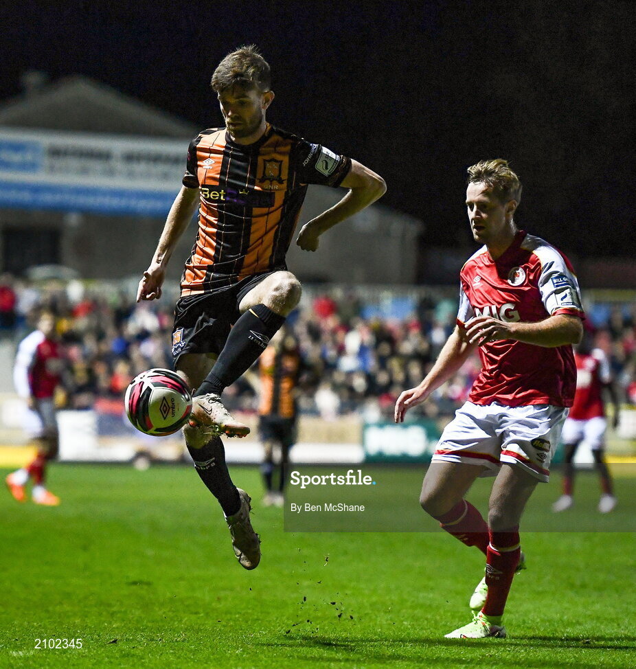 22 October 2021; Sam Stanton of Dundalk in action against Billy King of St Patrick's Athletic during the Extra.ie FAI Cup Semi-Final match between St Patrick's Athletic and Dundalk at Richmond Park in Dublin. Photo by Ben McShane/Sportsfile