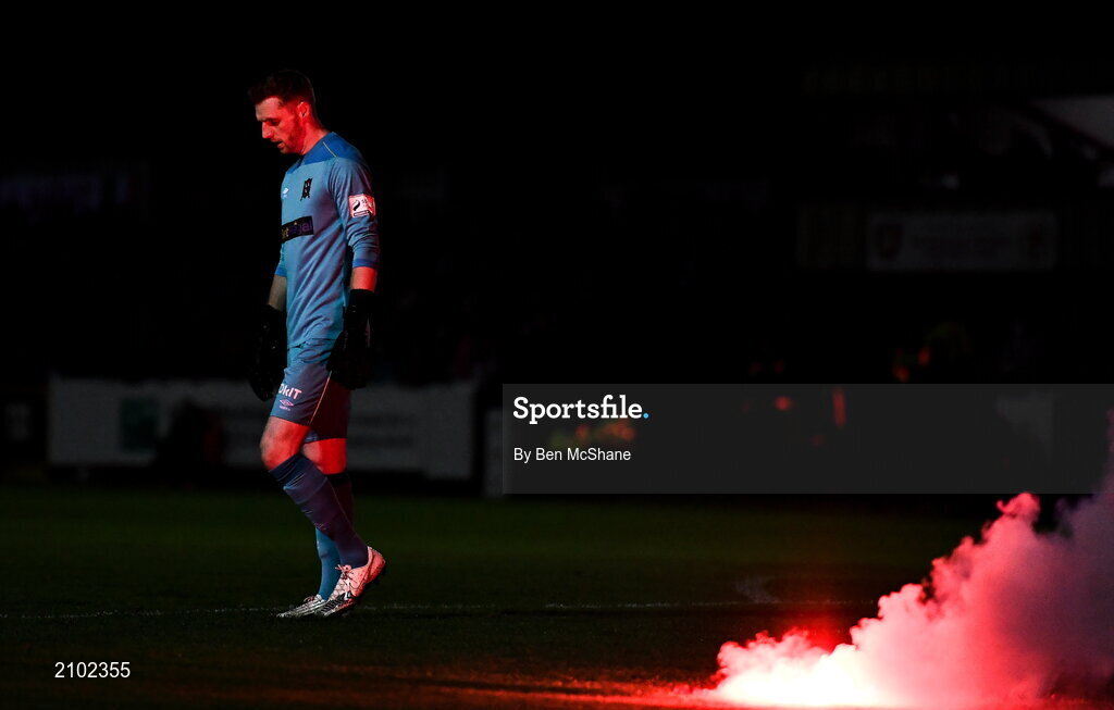 22 October 2021; Dundalk goalkeeper Peter Cherrie reacts as a flare is thrown onto the pitch during the Extra.ie FAI Cup Semi-Final match between St Patrick's Athletic and Dundalk at Richmond Park in Dublin. Photo by Ben McShane/Sportsfile