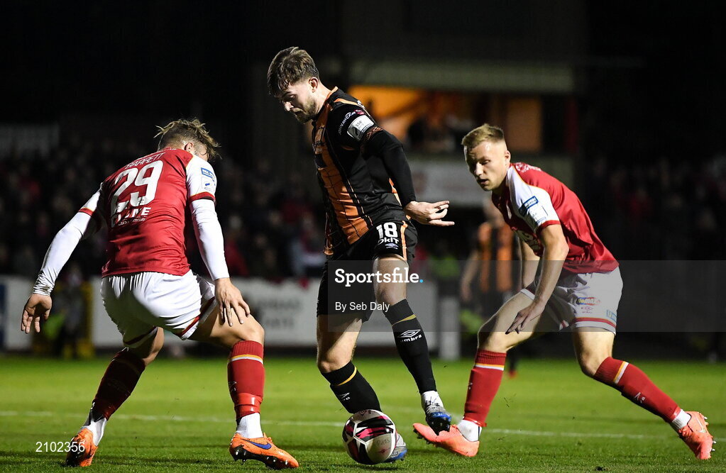 22 October 2021; Will Patching of Dundalk in action against Paddy Barrett, left, and Jamie Lennon of St Patrick's Athletic during the Extra.ie FAI Cup semi-final match between St Patrick's Athletic and Dundalk at Richmond Park in Dublin. Photo by Seb Daly/Sportsfile