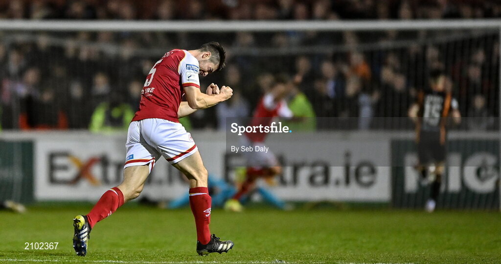 22 October 2021; Lee Desmond of St Patrick's Athletic celebrates his side's first goal, scored by team-mate Billy King, during the Extra.ie FAI Cup semi-final match between St Patrick's Athletic and Dundalk at Richmond Park in Dublin. Photo by Seb Daly/Sportsfile