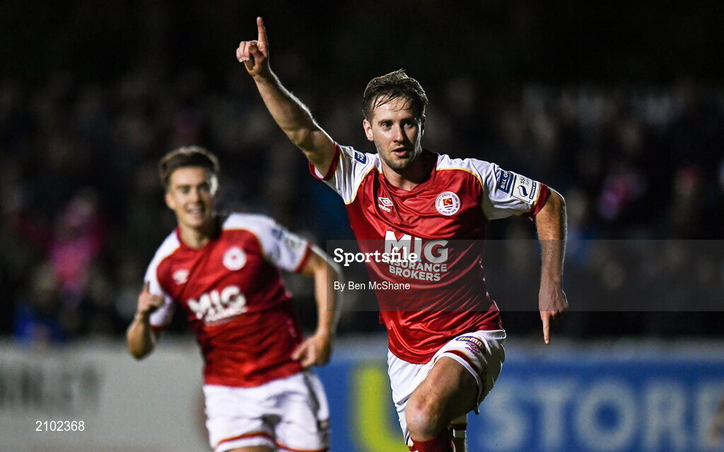 22 October 2021; Billy King of St Patrick's Athletic celebrates after scoring his side's first goal during the Extra.ie FAI Cup Semi-Final match between St Patrick's Athletic and Dundalk at Richmond Park in Dublin. Photo by Ben McShane/Sportsfile