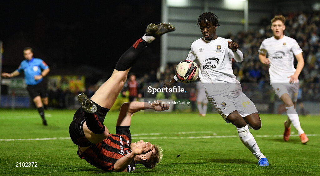 22 October 2021; Ciarán Kelly of Bohemians in action against Junior Quitirna of Waterford during the Extra.ie FAI Cup Semi-Final match between Bohemians and Waterford at Dalymount Park in Dublin. Photo by Stephen McCarthy/Sportsfile