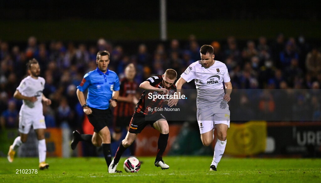 22 October 2021; Ross Tierney of Bohemians is tackled by Eddie Nolan of Waterford during the Extra.ie FAI Cup Semi-Final match between Bohemians and Waterford at Dalymount Park in Dublin. Photo by Eóin Noonan/Sportsfile