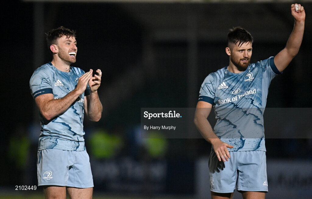22 October 2021; Hugo Keenan, left, and Ross Byrne of Leinster celebrate after the United Rugby Championship match between Glasgow Warriors and Leinster at Scotstoun Stadium in Glasgow, Scotland. Photo by Harry Murphy/Sportsfile