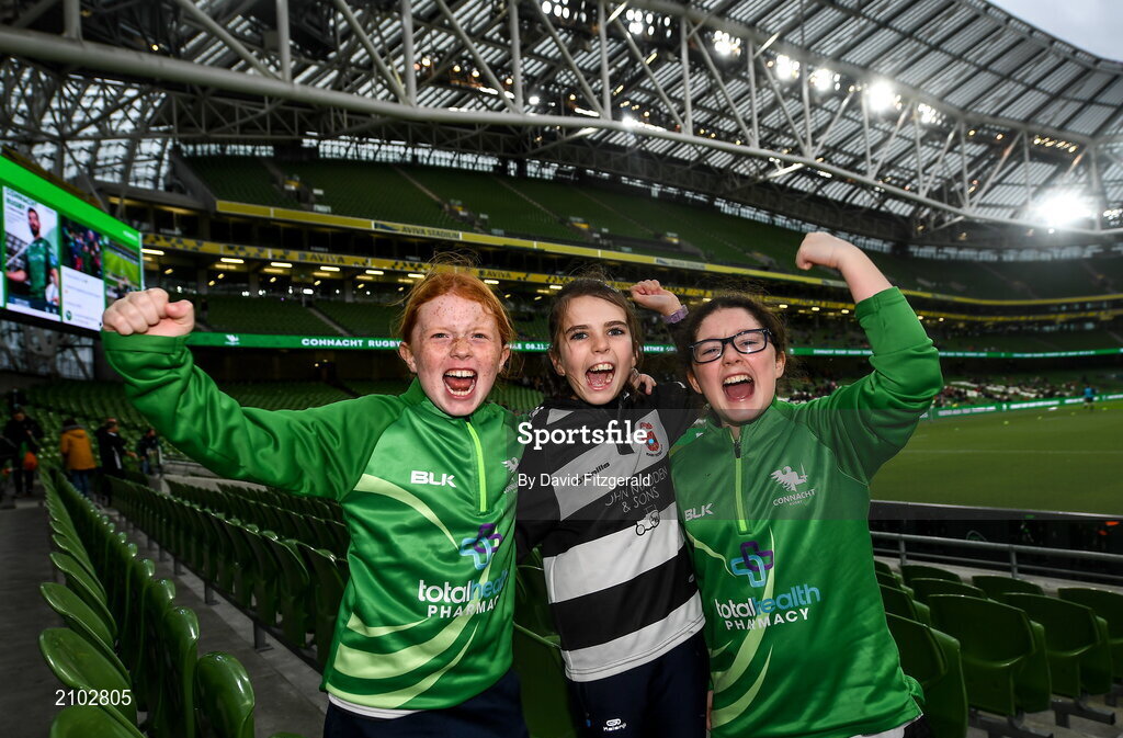 23 October 2021; Connacht supporters, from left, Enya McGarry, age 9, Muireann O'Connell, age 9, and Ava May, age 10, from Ballinrobe, Mayo before the United Rugby Championship match between Connacht and Ulster at Aviva Stadium in Dublin. Photo by David Fitzgerald/Sportsfile