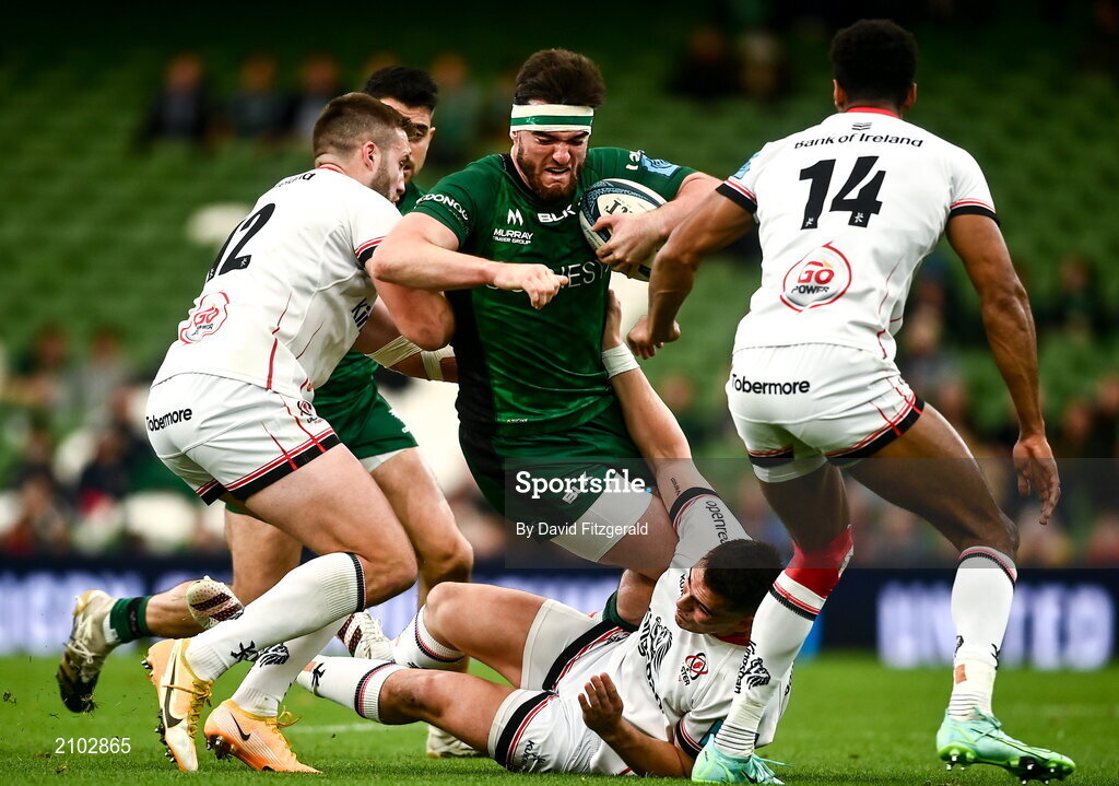 23 October 2021; Tom Daly of Connacht is tackled by Ulster players, from left, Stuart McCloskey, James Hume and Robert Baloucoune during the United Rugby Championship match between Connacht and Ulster at Aviva Stadium in Dublin. Photo by David Fitzgerald/Sportsfile