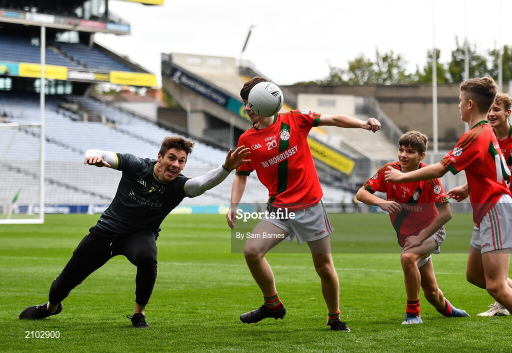 25 October 2021; John West Féile Ambassador and Galway footballer Shane Walsh with footballers from Palatine GAA Club, Co Carlow, during the John West Féile 50th anniversary celebrations, which brought 32 U-15 club teams from all over the country to play in all four codes at Croke Park over the bank holiday weekend. Photo by Sam Barnes/Sportsfile