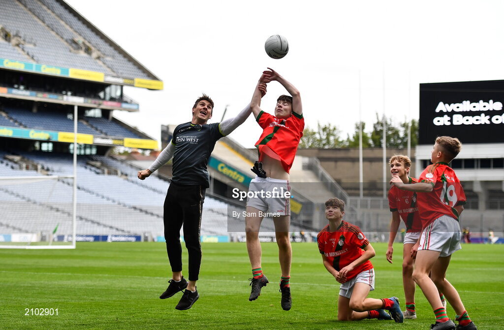 25 October 2021; John West Féile Ambassador and Galway footballer Shane Walsh with footballers from Palatine GAA Club, Co Carlow, from left, James Carpenter, Ewan Breen, Jack Keating and Luke Campion, during the John West Féile 50th anniversary celebrations, which brought 32 U-15 club teams from all over the country to play in all four codes at Croke Park over the bank holiday weekend. Photo by Sam Barnes/Sportsfile