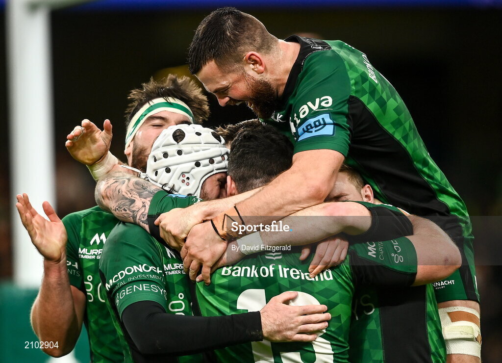 23 October 2021; Mack Hansen of Connacht second from left is congratulated by team-mates after scoring his side's second try during the United Rugby Championship match between Connacht and Ulster at Aviva Stadium in Dublin. Photo by David Fitzgerald/Sportsfile