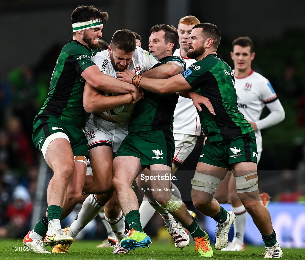 23 October 2021; Stuart McCloskey of Ulster is tackled by Tom Daly, Jack Carty and Conor Oliver of Connacht during the United Rugby Championship match between Connacht and Ulster at Aviva Stadium in Dublin. Photo by Brendan Moran/Sportsfile
