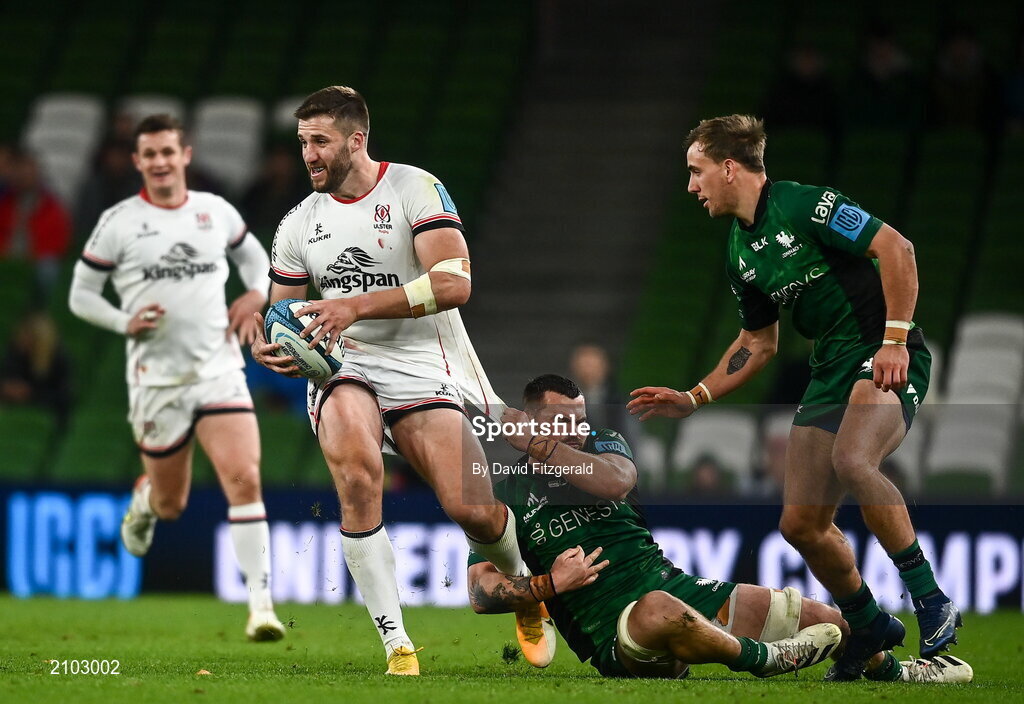 23 October 2021; Stuart McCloskey of Ulster is tackled by Conor Oliver of Connacht during the United Rugby Championship match between Connacht and Ulster at Aviva Stadium in Dublin. Photo by David Fitzgerald/Sportsfile