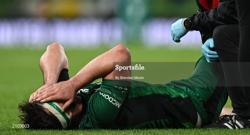 23 October 2021; Tom Daly of Connacht receives medical attention before leaving the pitch with an injury during the United Rugby Championship match between Connacht and Ulster at Aviva Stadium in Dublin. Photo by Brendan Moran/Sportsfile