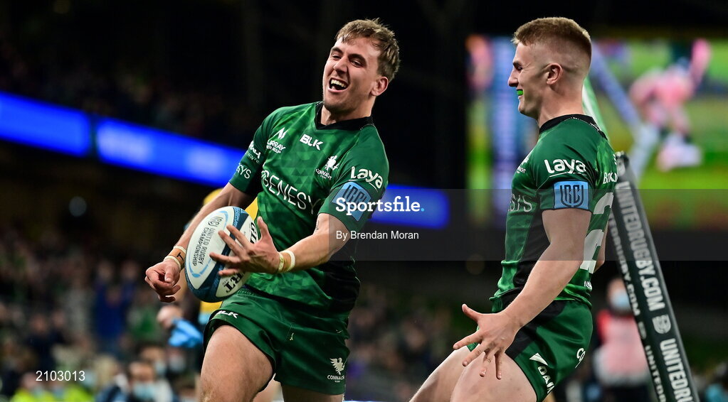 23 October 2021; John Porch of Connacht celebrates with team-mate Conor Fitzgerald, right, after scoring their side's third try during the United Rugby Championship match between Connacht and Ulster at Aviva Stadium in Dublin. Photo by Brendan Moran/Sportsfile