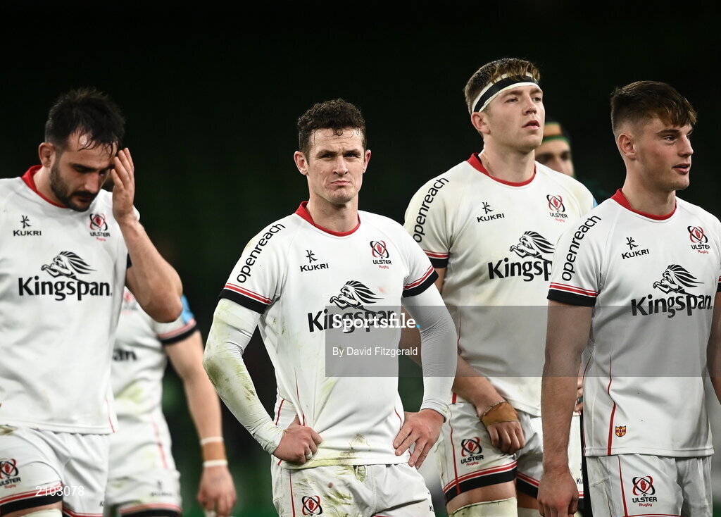 23 October 2021; Billy Burns of Ulster, centre, and team-mates after the United Rugby Championship match between Connacht and Ulster at Aviva Stadium in Dublin. Photo by David Fitzgerald/Sportsfile