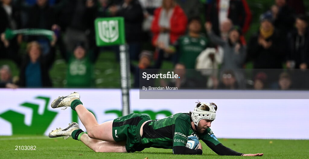23 October 2021; Mack Hansen of Connacht scores his side's fifth try during the United Rugby Championship match between Connacht and Ulster at Aviva Stadium in Dublin. Photo by Brendan Moran/Sportsfile