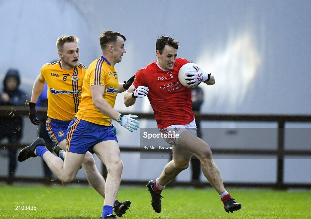 23 October 2021; Diarmuid O'Connor of Ballintubber in action against Adam Naughton and Nathan Armstrong of Knockmore during the Mayo County Senior Club Football Championship Quarter-Final match between Ballintubber and Knockmore at Connacht GAA Centre in Bekan, Mayo. Photo by Matt Browne/Sportsfile