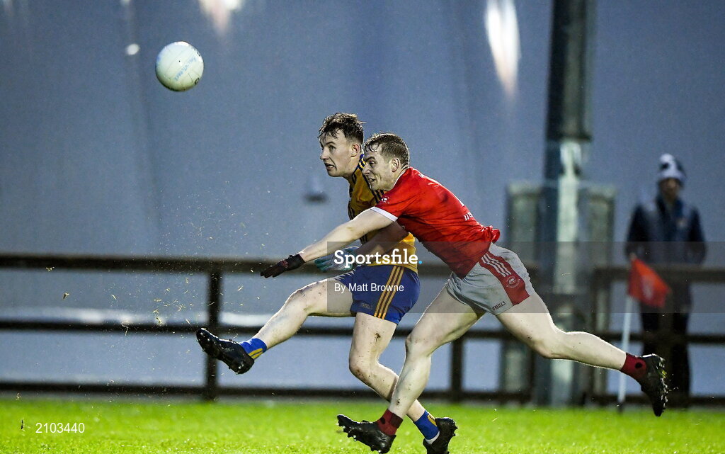 23 October 2021; Adam Naughton of Knockmore in action against Hugh Geraghty of Ballintubber during the Mayo County Senior Club Football Championship Quarter-Final match between Ballintubber and Knockmore at Connacht GAA Centre in Bekan, Mayo. Photo by Matt Browne/Sportsfile