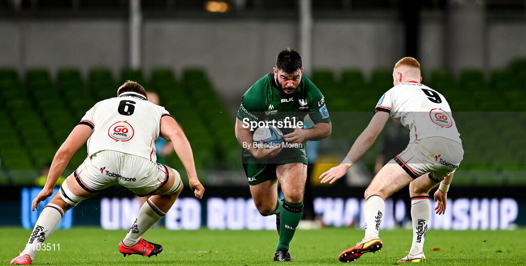23 October 2021; Matthew Burke of Connacht in action against Matty Rea and Nathan Doak of Ulster during the United Rugby Championship match between Connacht and Ulster at Aviva Stadium in Dublin. Photo by Brendan Moran/Sportsfile