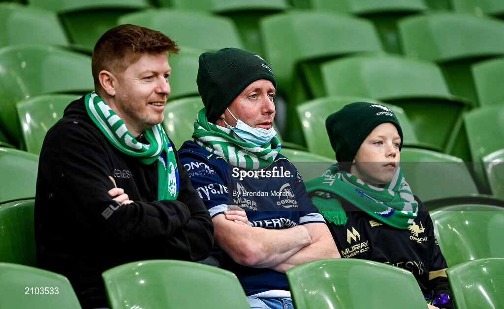23 October 2021; Connacht supporters during the United Rugby Championship match between Connacht and Ulster at Aviva Stadium in Dublin. Photo by Brendan Moran/Sportsfile