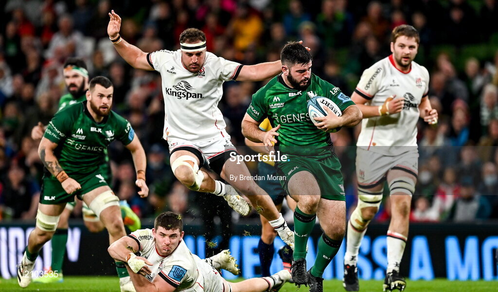 23 October 2021; Matthew Burke of Connacht breaks away from Nick Timoney and Rob Herring of Ulster during the United Rugby Championship match between Connacht and Ulster at Aviva Stadium in Dublin. Photo by Brendan Moran/Sportsfile