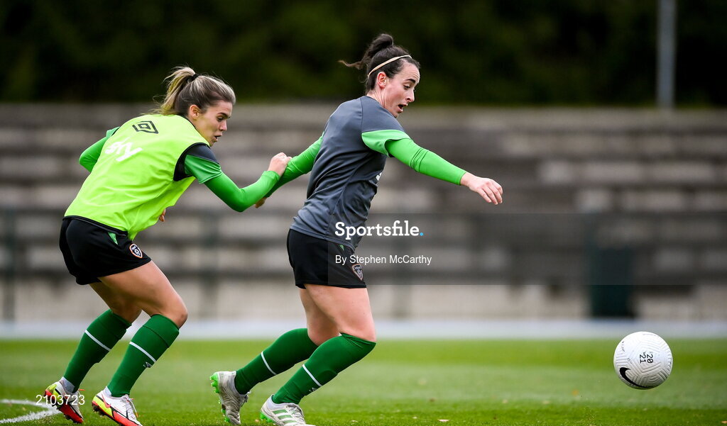 24 October 2021; Roma McLaughlin and Jamie Finn, right, during a Republic of Ireland Women training session at Leppavaara Stadium in Helsinki, Finland. Photo by Stephen McCarthy/Sportsfile