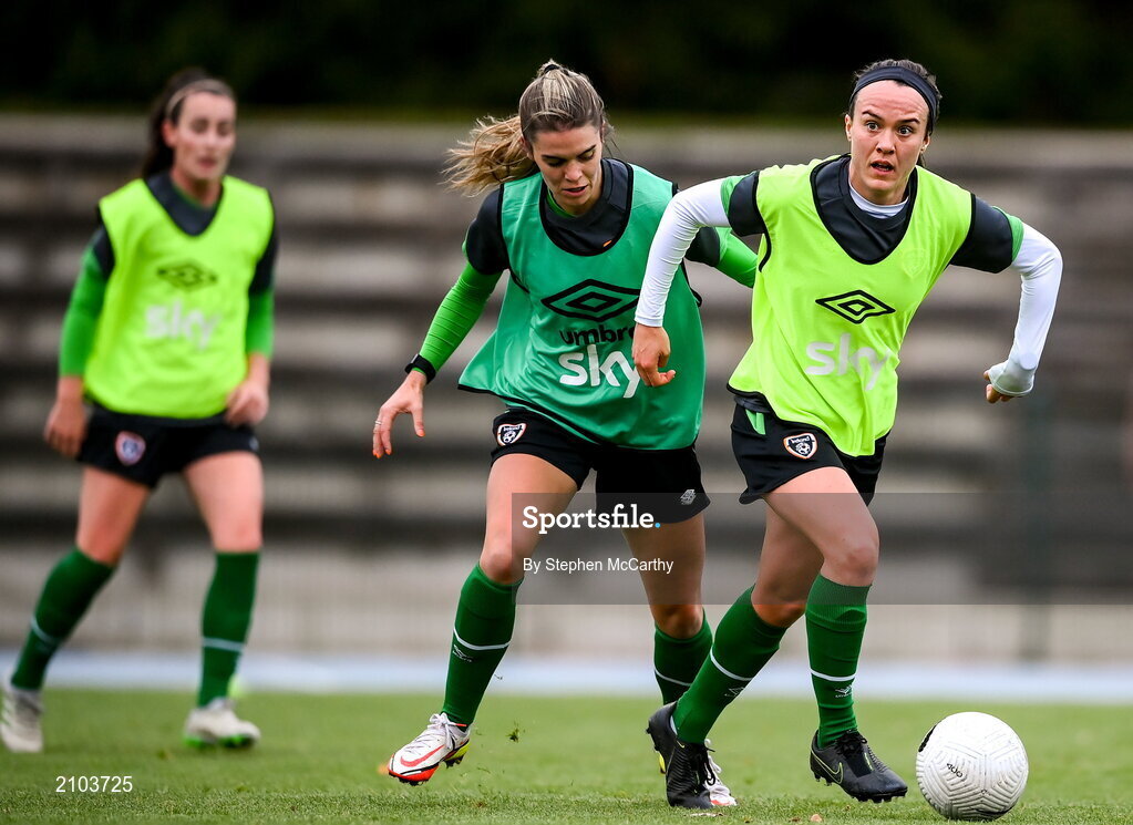 24 October 2021; Ciara Grant, right, and Jamie Finn during a Republic of Ireland Women training session at Leppavaara Stadium in Helsinki, Finland. Photo by Stephen McCarthy/Sportsfile
