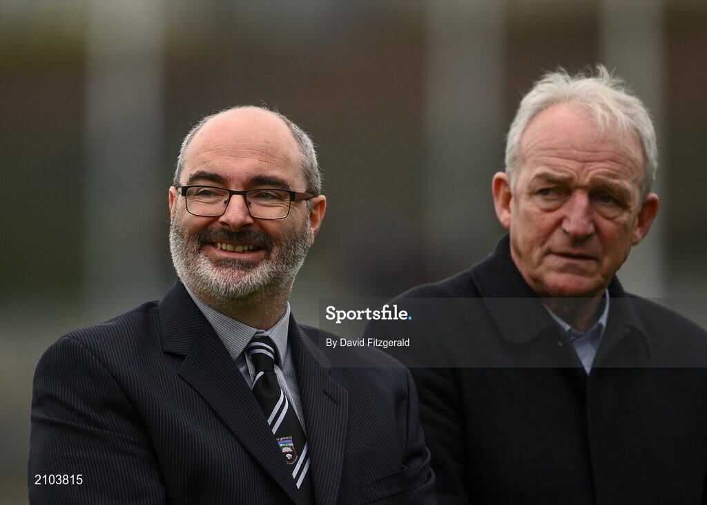 24 October 2021; Sligo County Chairman Sean Carroll, left, and Connacht GAA Council President John Murphy during the Sligo County Senior Club Football Championship Final match between Tourlestrane and Coolera Strandhill at Markievicz Park in Sligo. Photo by David Fitzgerald/Sportsfile