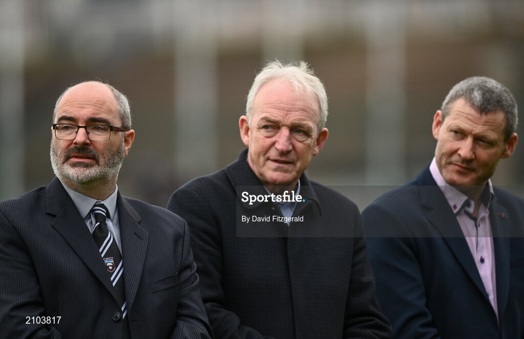 24 October 2021; Sligo County Chairman Sean Carroll, left, Connacht GAA Council President John Murphy, centre, and Sligo LGFA Chairman Ray Carden during the Sligo County Senior Club Football Championship Final match between Tourlestrane and Coolera Strandhill at Markievicz Park in Sligo. Photo by David Fitzgerald/Sportsfile