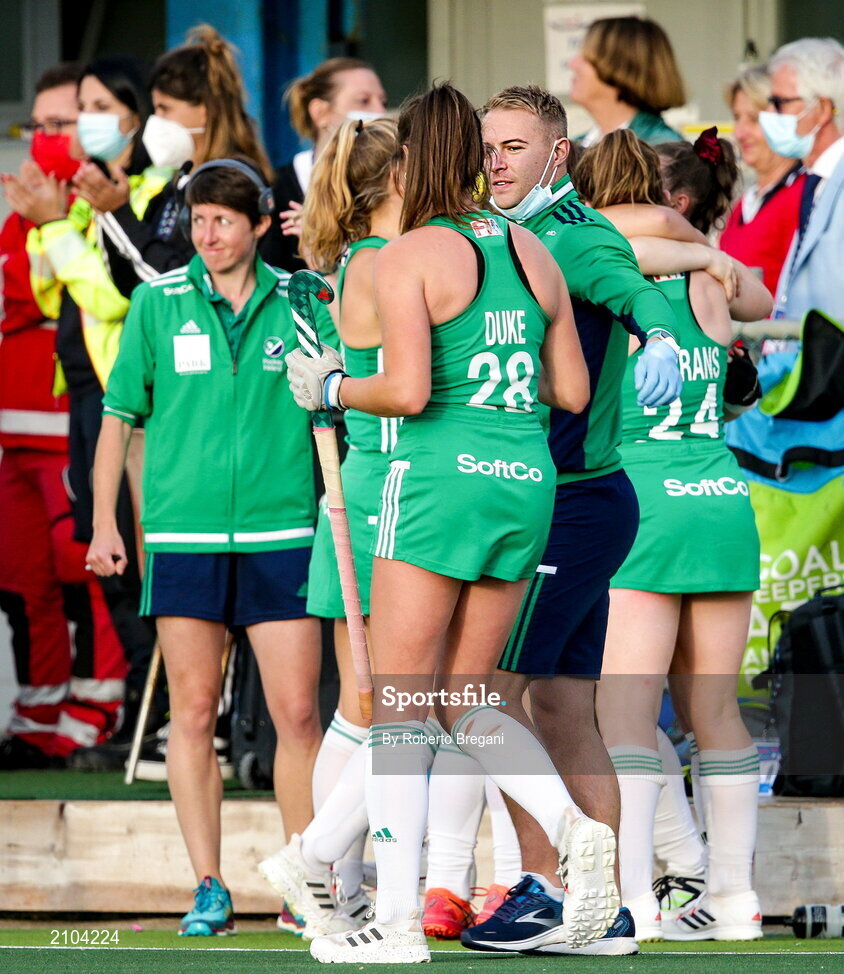 24 October 2021; Ireland players celebrate victory following the FIH Women's World Cup European Qualifier Final match between Ireland and Wales at Pisa in Italy. Photo by Roberto Bregani/Sportsfile