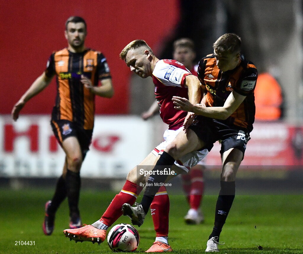 25 October 2021; Jamie Lennon of St Patrick's Athletic is tackled by Daniel Kelly of Dundalk during the SSE Airtricity League Premier Division match between St Patrick's Athletic and Dundalk at Richmond Park in Dublin. Photo by Ben McShane/Sportsfile